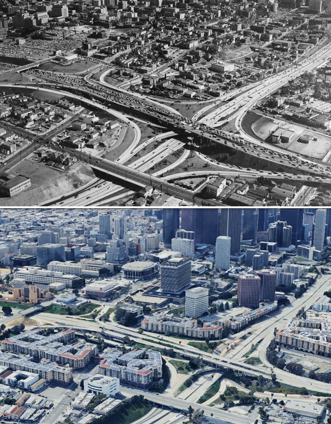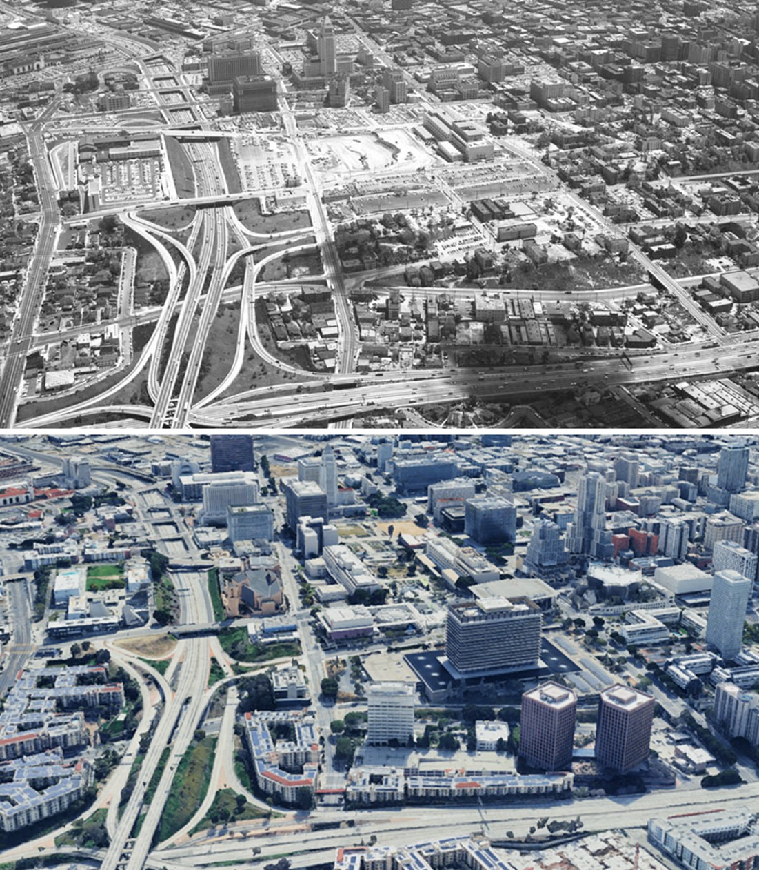 (1954 vs. 1970)* - Aerial view looking southeast over the Four Level Interchange showing Bunker Hill’s transformation from a working-class neighborhood into the city’s civic and cultural heart. |