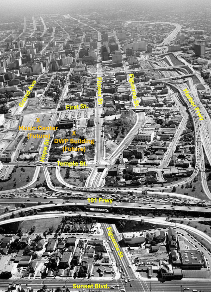 Historical Notes The empty land to the left of center is future location of both the DWP General Office Building and the Dorothy Chandler Pavilion. |