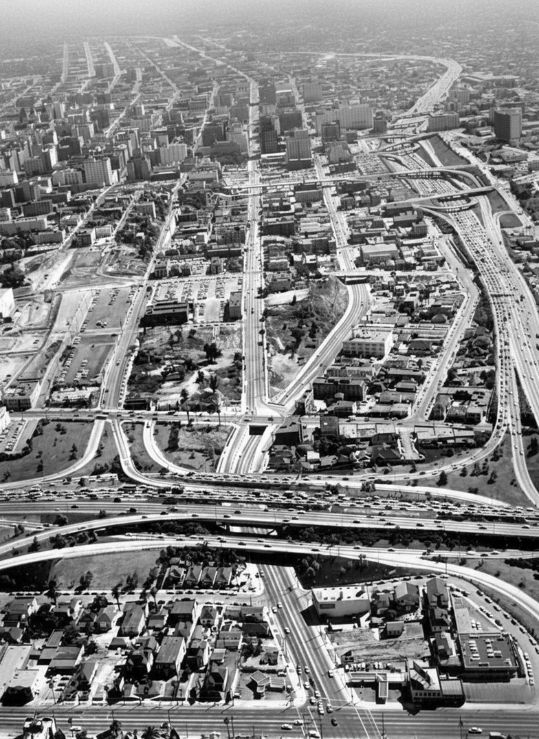 Historical Notes Completed in 1949 and fully opened in 1953, the Four Level Interchange connected U.S. Route 101 (Hollywood Freeway and Santa Ana Freeway) with State Route 110 (Harbor Freeway and Arroyo Seco Parkway). Its completion marked a turning point for downtown mobility, opening access to the Civic Center and paving the way—literally and figuratively—for large-scale redevelopment on Bunker Hill. |