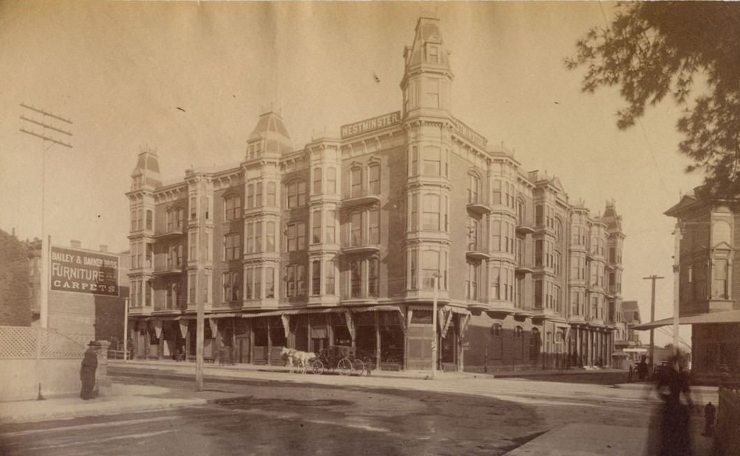 | (ca. 1895)* - View of the four-story Westminster Hotel on the NE corner of South Main and 4th Streets; horse-drawn carriage in front. Down the street to the left is the N.P. Bailey Furniture store. |