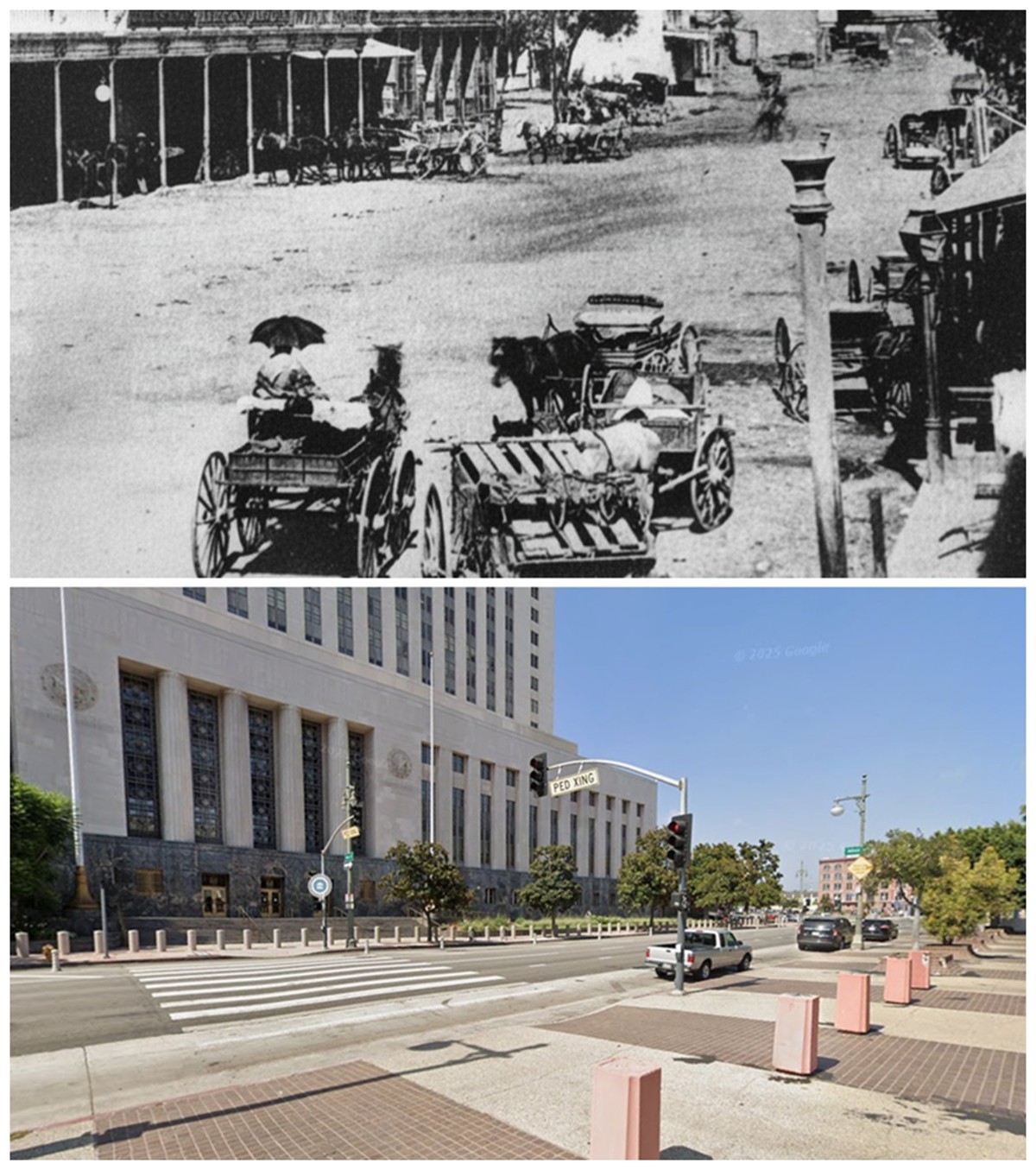 | (1858 vs. 2023)* – A 'Then and Now' view of the Los Angeles Plaza. Photo comparison by Jack Feldman. |