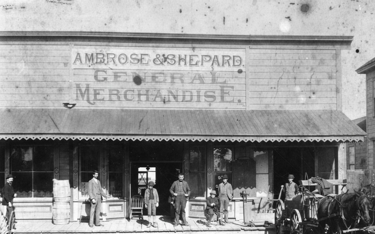 | (ca. 1880s)^ - Panoramic view of L.A. in the 1880s. Shown in the foreground is the Second Street Cable Car, located west of downtown in an area called "Crown Hill." Cable car is stopped in front of W.C. Bowers staple and fancy groceries store. On the left side is a small Real Estate building. In the background several dwellings may be seen scattered over the bare hills. |