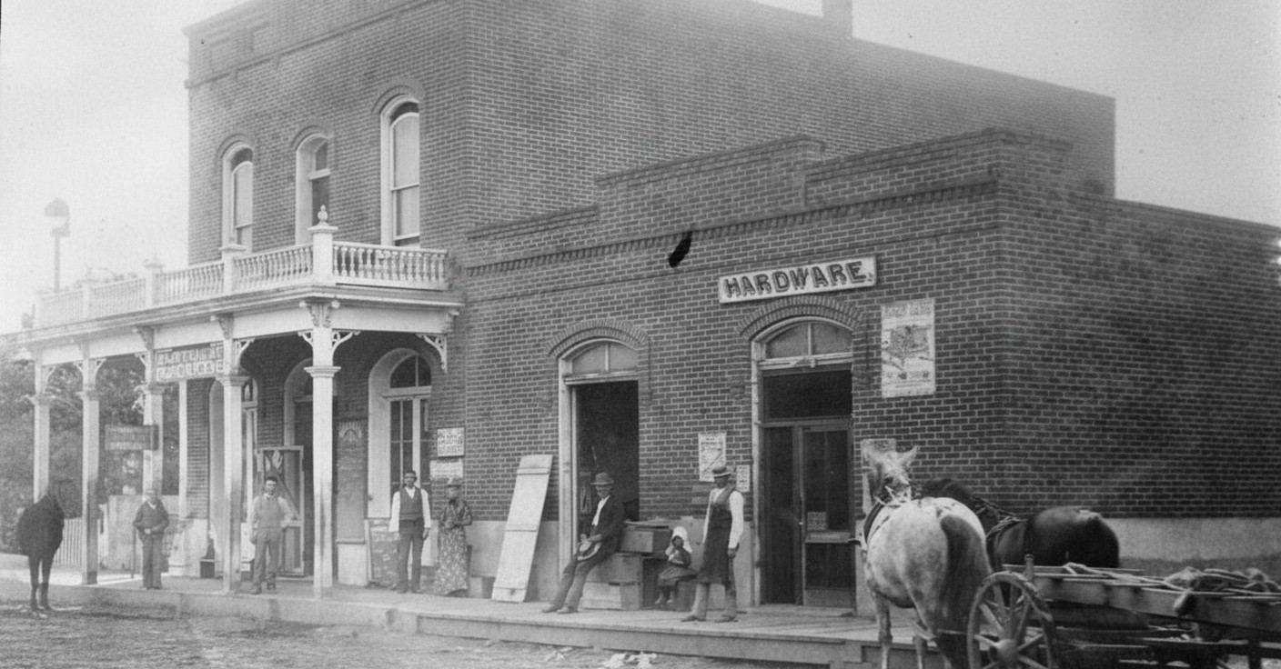 | (1886)* - The northwest corner of 1st and Broadway in 1886. Horses, carriages, and liveries dominated the scene, with the De Turk Livery Feed & Sale Stable occupying this corner. |