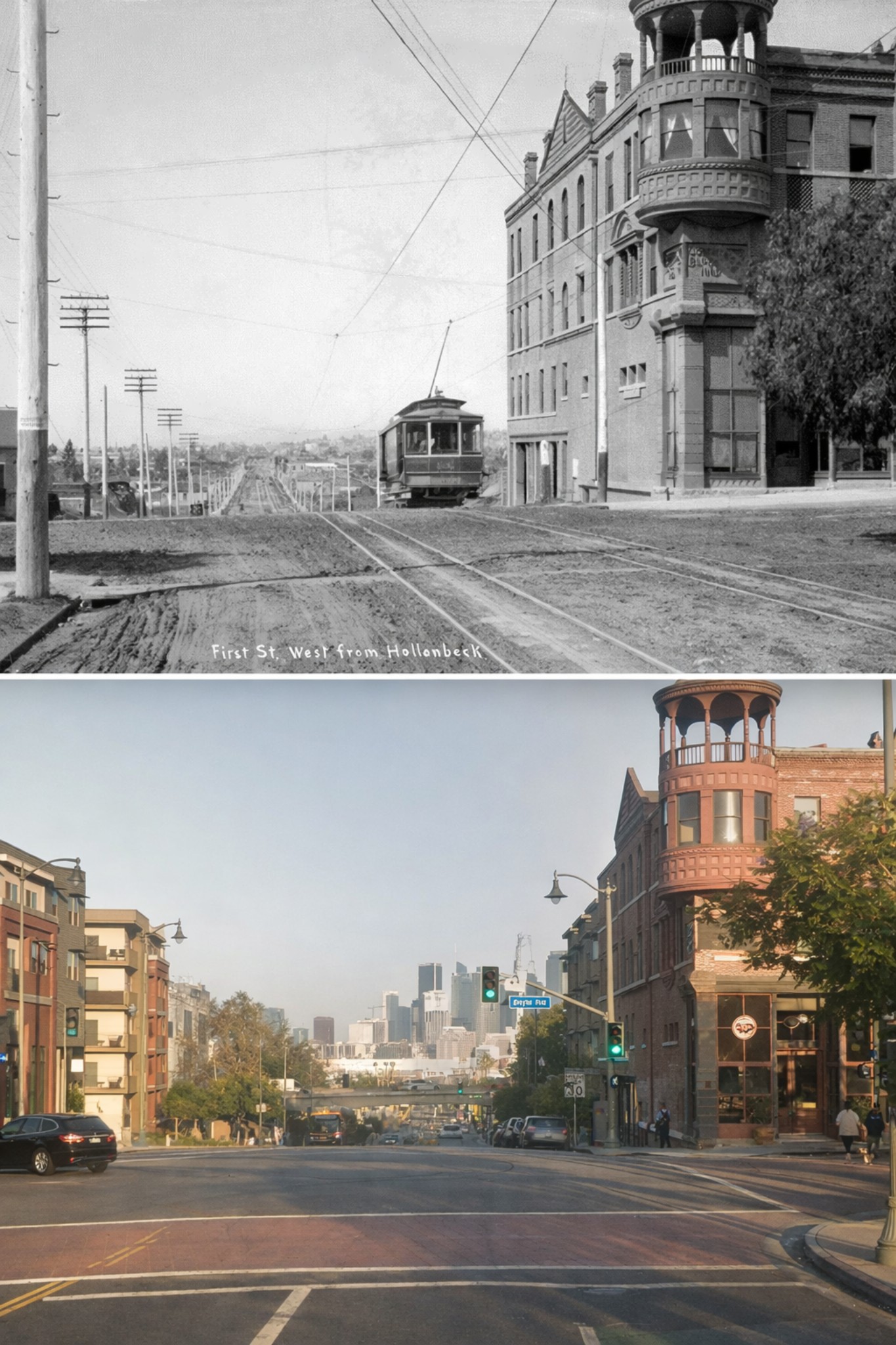 | (1880 / 2023)* - Looking southwest along Second Street (foreground) and Olive Street (intersecting at the upper right) in Bunker Hill, where the steep slope has long posed challenges for walking, biking, and even horse-drawn carriages. Photo comparison by Jack Feldman. |