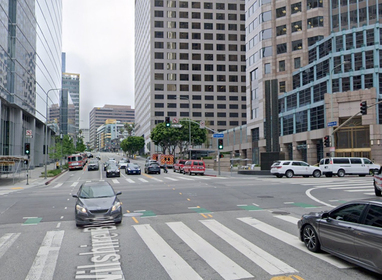 | (2015)##^ – Google street view looking north on Figueroa St. from s/o Washington Boulevard, showing the Bob Hope Patriotic Hall. In the distance is the Santa Monica Freeway. |