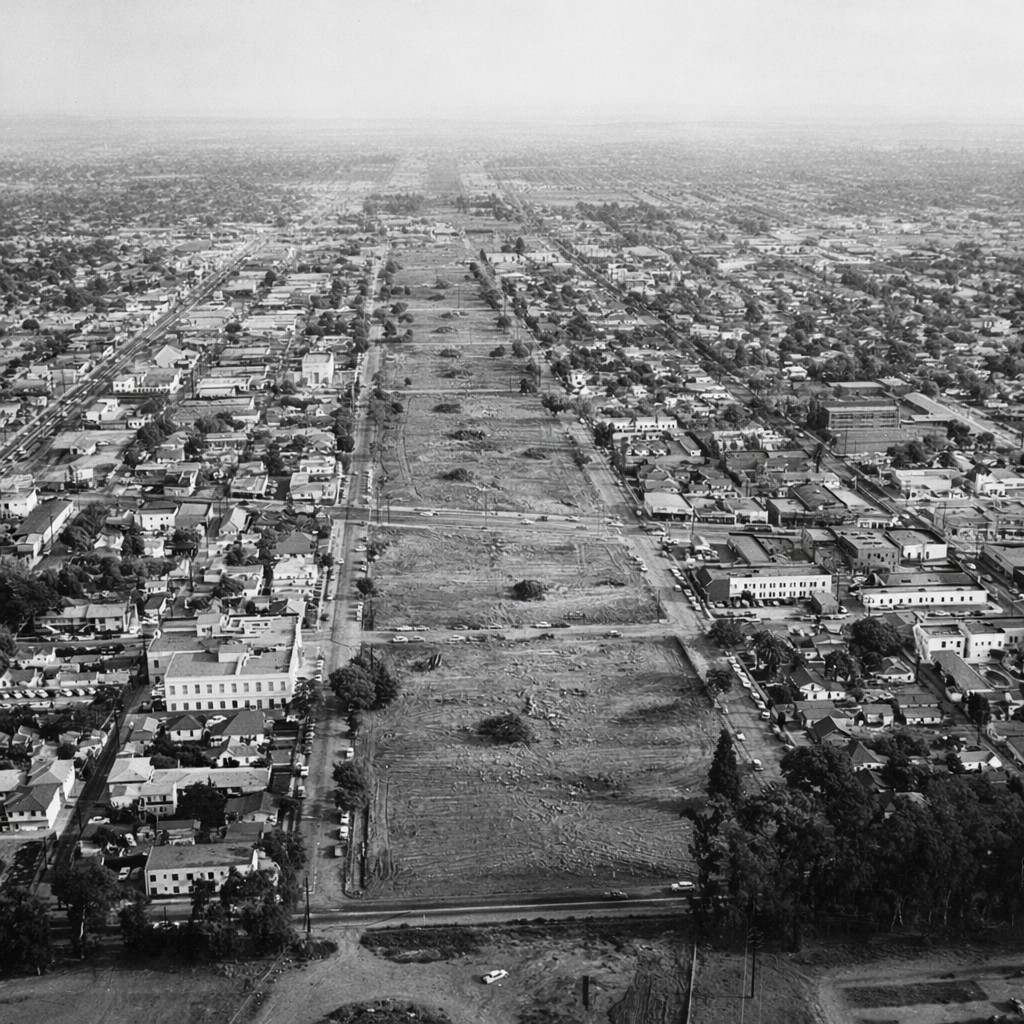 | (1954)^*** – Aerial view looking west showing the full extent of the Miracle Mile at left with Park La Brea Towers at upper center-right. The intersection of Wilishire and La Brea is at lower-left. The Prudential Building and La Brea Tar Pits can be seen at upper center-left. |