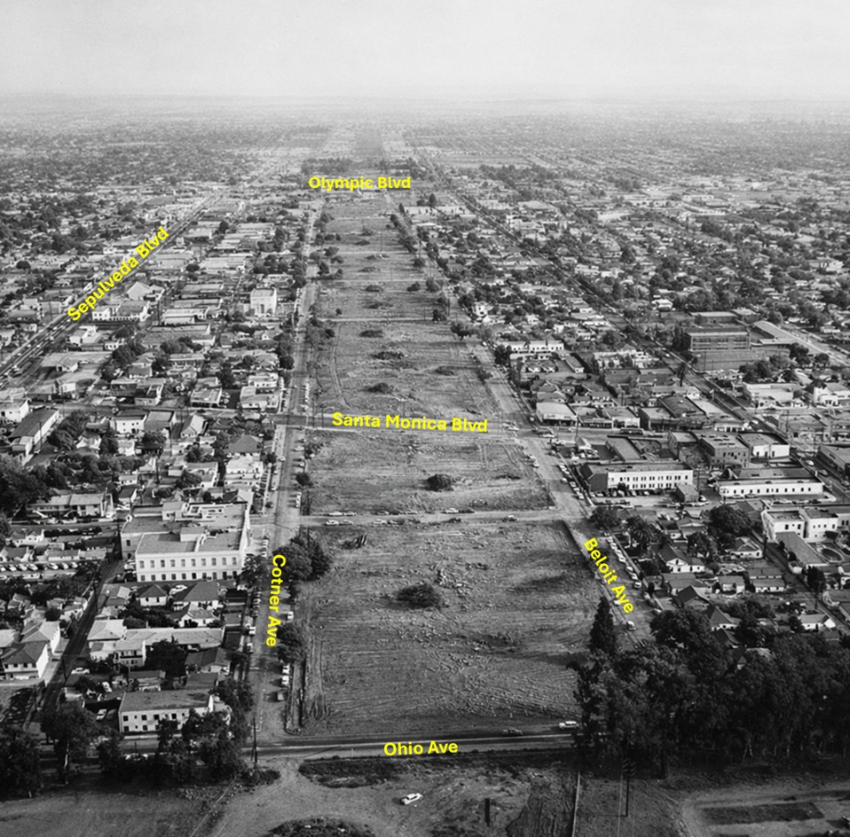 | (ca. 1950s)*# - Aerial view looking east showing the Rancho Golf Course and the Cheviot Hills playground. Pico Boulevard runs away from the camera on the left. Motor Avenue runs horizontally at upper-center and dead ends at Pico Boulevard in front of the Fox Studios (upper-center left). |