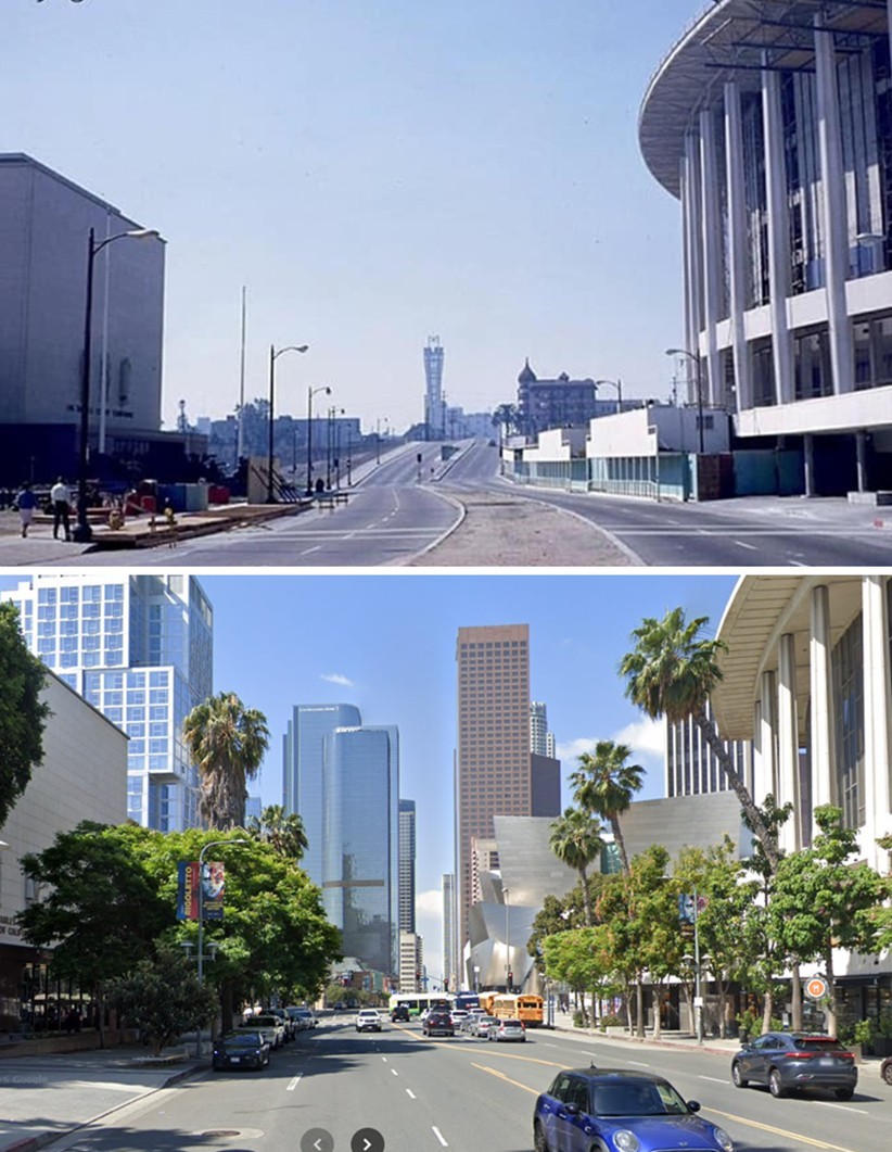 (1967 vs 2024) – View looking north as seen from the SW corner of 1st and Hope streets with the DWP Building at left and the Dorothy Chandler Pavilion in the distance on the right. Contemporary photo by Jack Feldman |