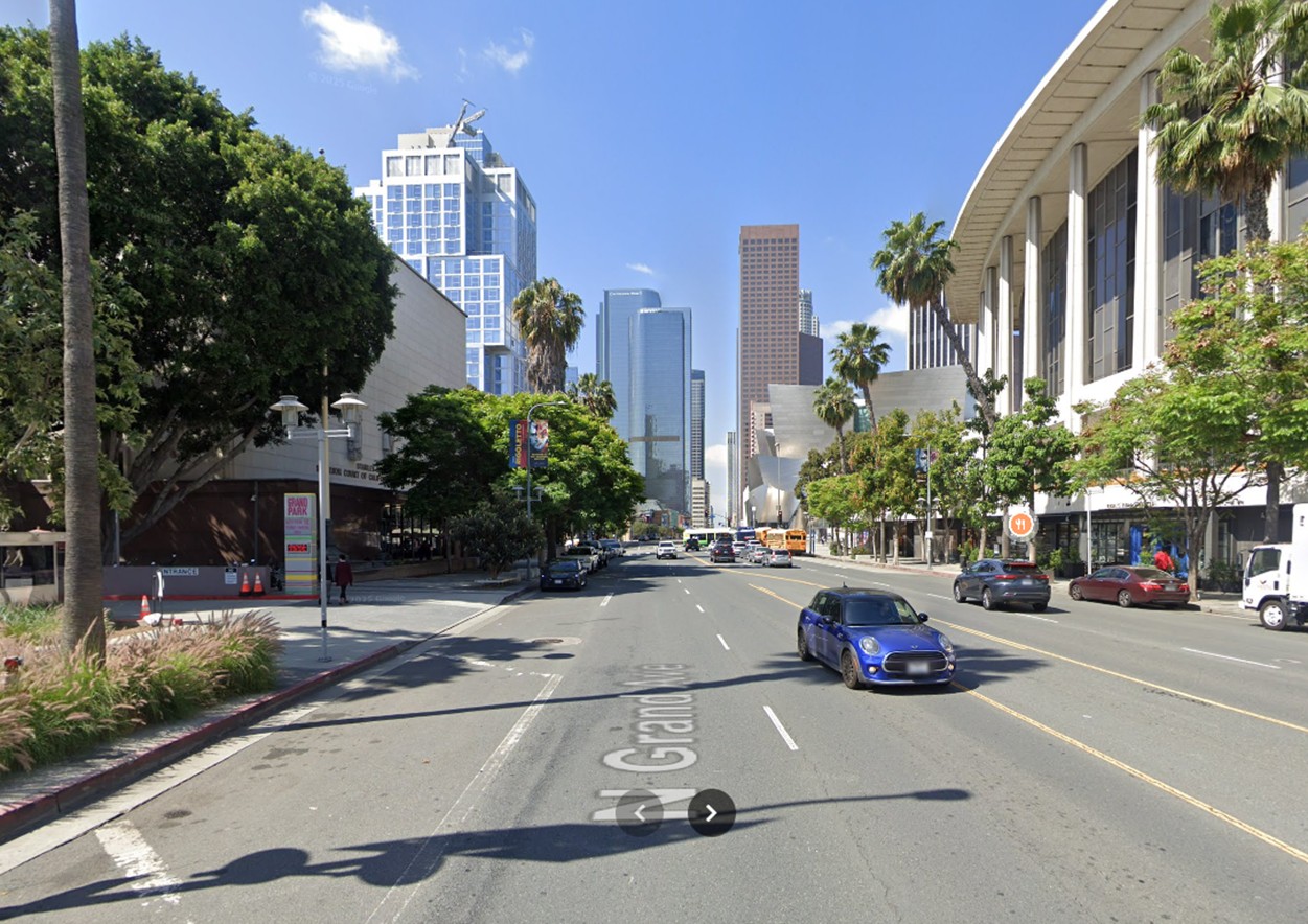 (2025)* - Looking south on Grand Avenue toward First Street. The view is now dominated by the Walt Disney Concert Hall (2003) and The Grand LA, Frank Gehry’s mixed-use complex completed in the 2020s. At Grand and 2nd, The Broad Museum (2015) now occupies the site of the old Dome Apartments. The Music Center Plaza, reopened in 2019 after a major renovation, ties the campus together as a public square. |