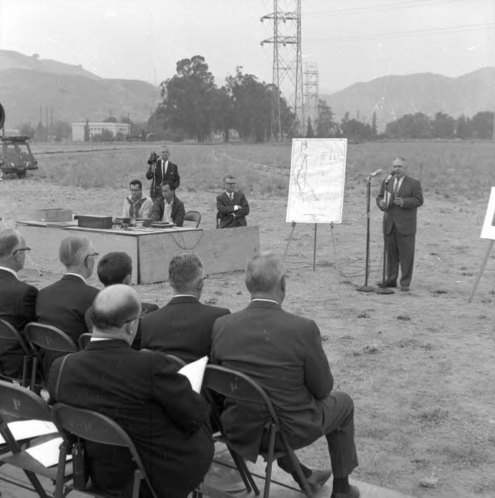 | (1967)* - Groundbreaking ceremony for the Sylmar Converter Station at its original site west of Interstate 5. Los Angeles Department of Water and Power General Manager E. L. Kanouse stands at the microphone. Photo date: June 8, 1967. |