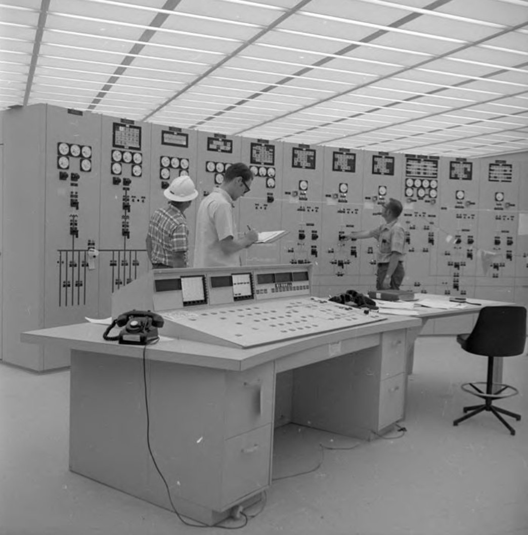 | (1936)^^ - Interior view showing the spacious and well-lit control room at RS-B. |