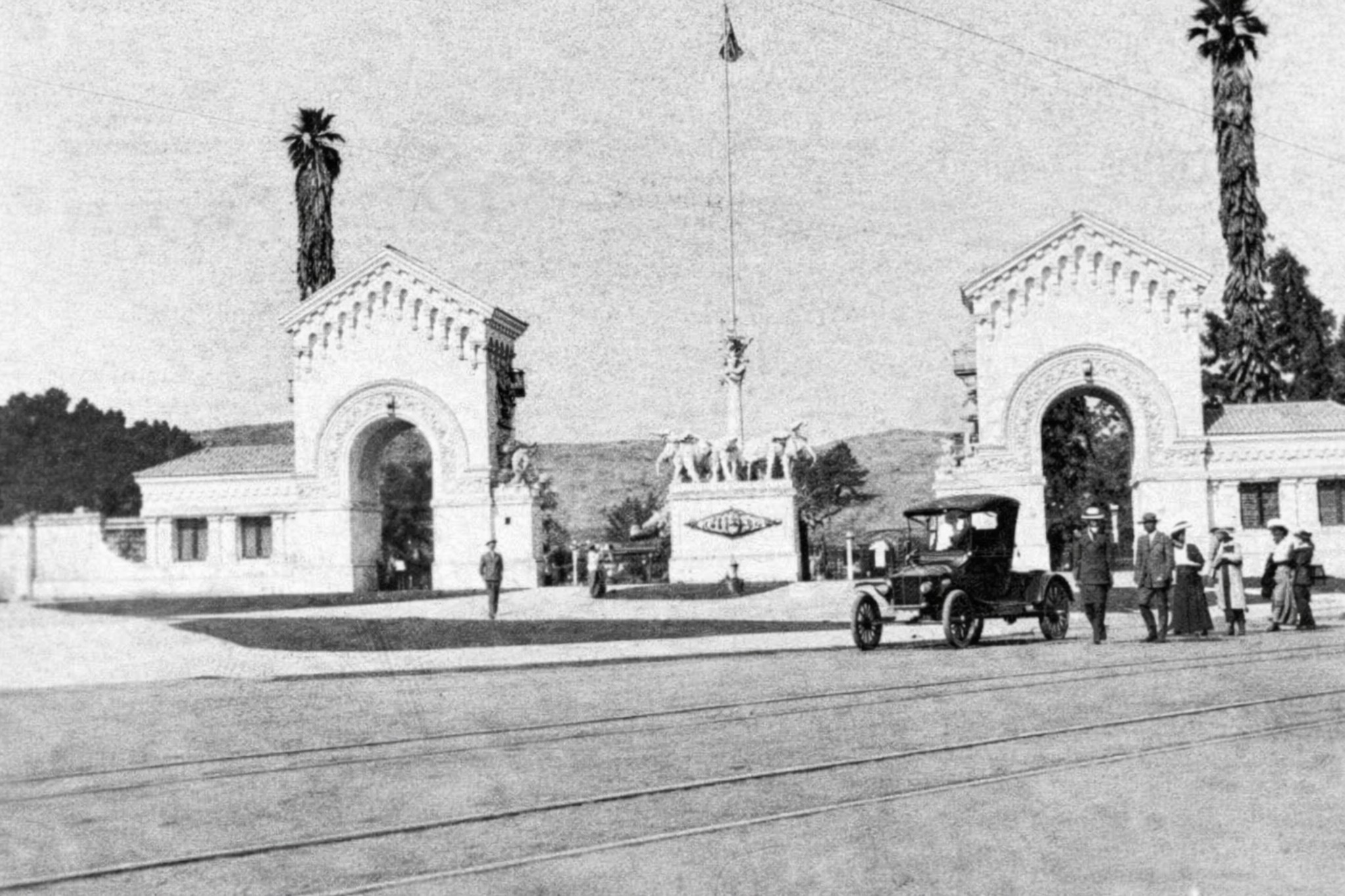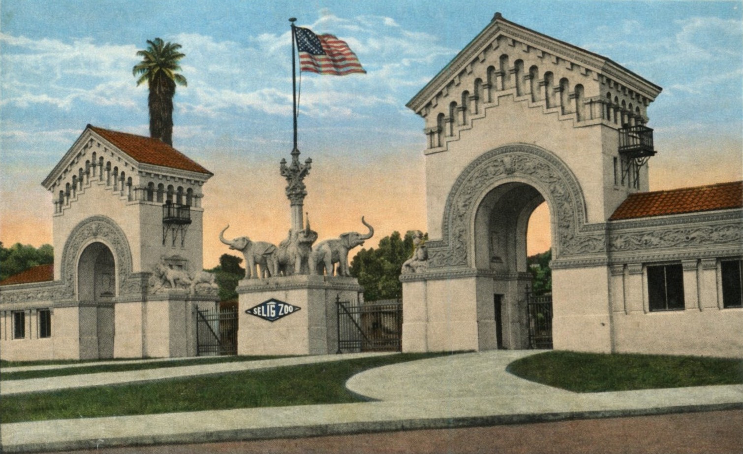 Historical Notes The entrance gates were designed to impress. Italian sculptor Carlo Romanelli created the dramatic elephant and lion statues that framed the ornate archways. Architect Arthur Burnett Benton designed structures inside the grounds. The decorative style reflected the theatrical spirit of early film production and public amusement parks. The gates stood near the intersection of Mission Road and what is still known today as Selig Place. |