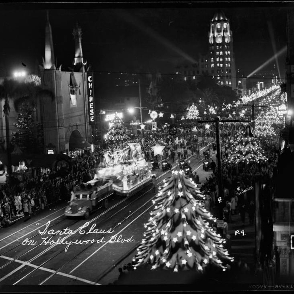 | (1945)* - A view looking down upon Hollywood Blvd. from the east on the eve of the annual Santa Claus Lane Parade (now called the Hollywood Christmas Parade). Christmas decorations can be seen on the festively lit boulevard. |