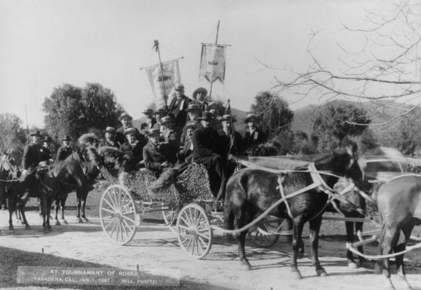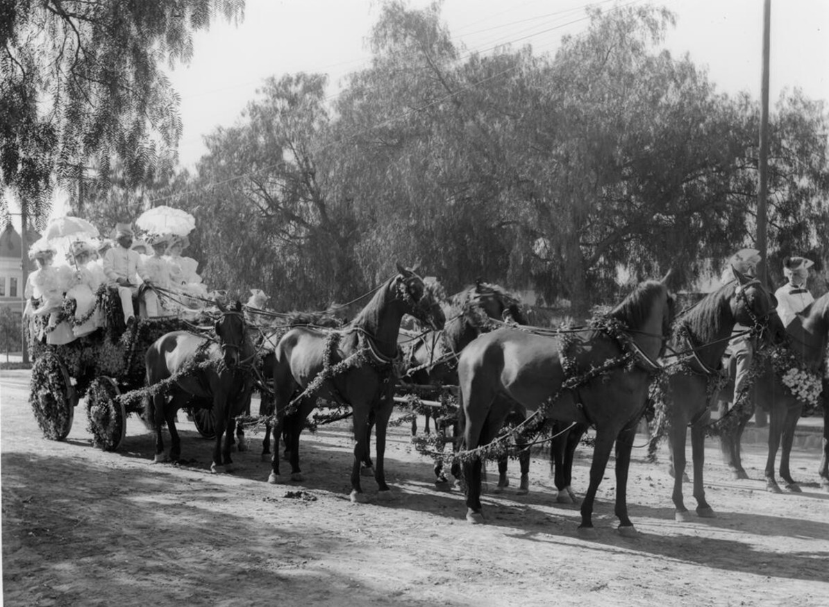 | (1896)* - Horse-drawn carriage packed with riders during the Rose Parade. Women hold parasols as the procession moves along the route. |