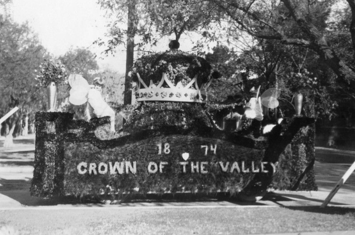 | (ca. 1894)* - Early Rose Parade float bearing the words “1874 Crown of the Valley,” Pasadena’s nickname and founding year. |