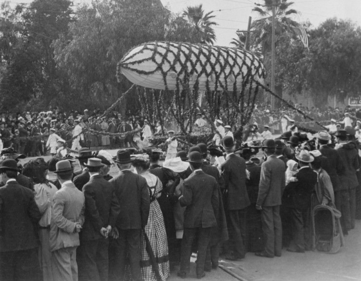 Historical Notes This clever float relied on illusion rather than size or complexity. The basket was actually moved by a person hidden inside, creating the appearance of flight. Such novelty entries were crowd favorites and show that early parade organizers valued creativity and humor as much as floral beauty. |