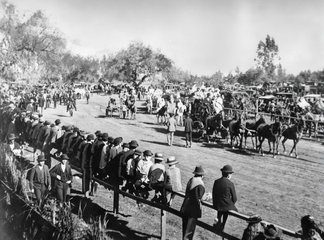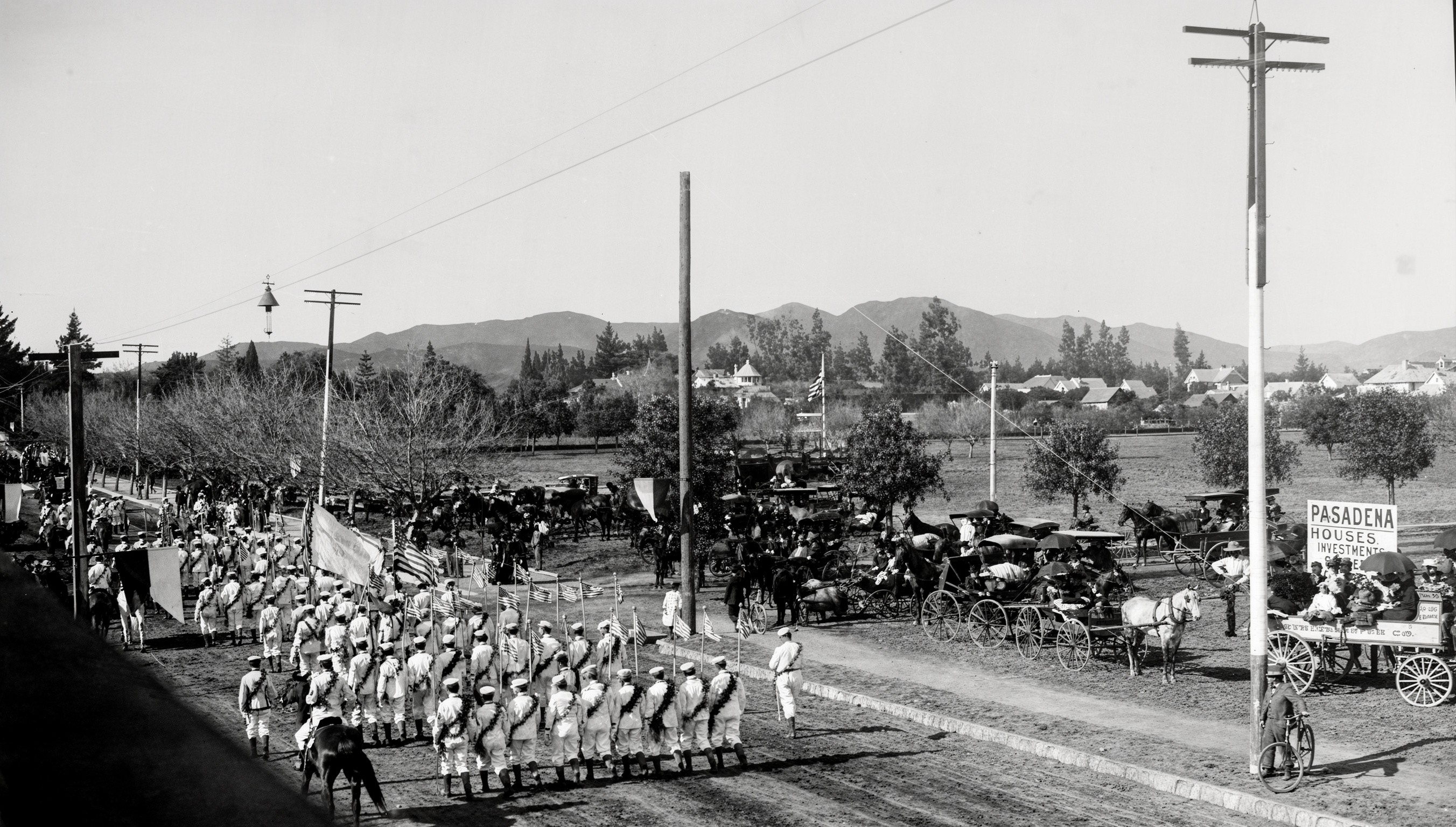 Historical Notes The Tournament of Roses began as a winter festival created by members of Pasadena’s Valley Hunt Club. Many had moved from the East and Midwest and wanted to promote Pasadena’s mild winter climate. Professor Charles F. Holder is often credited with suggesting the idea, noting that while much of the country was buried in snow, Southern California still had flowers in bloom and oranges on the trees. The first event on January 1, 1890 featured a parade of horse-drawn carriages decorated with flowers, followed by outdoor contests including foot races, polo matches, and tug of war. The pavilion and grandstand seen here were used for these afternoon events, which helped turn the parade into a full day celebration. |