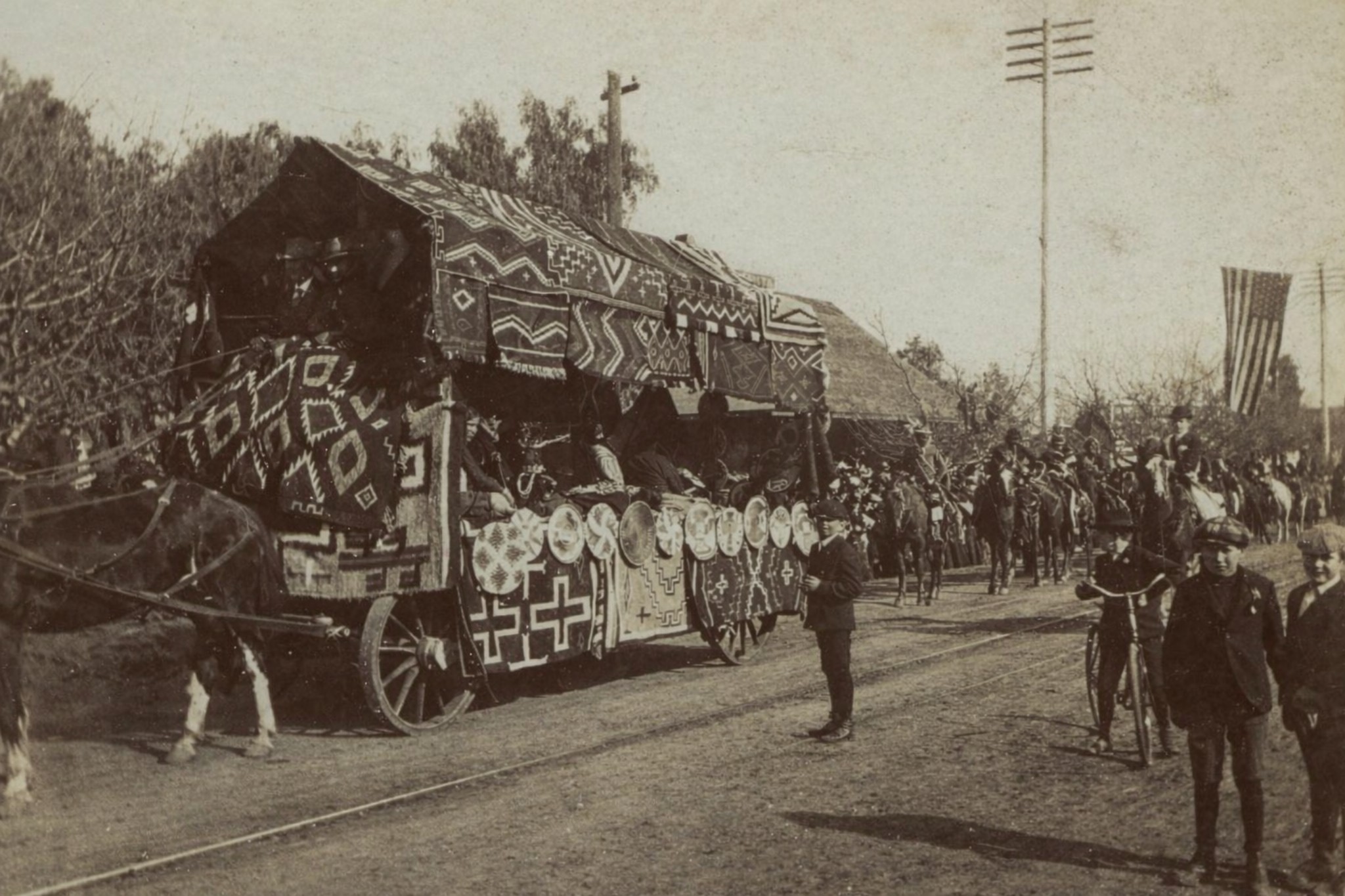 Historical Notes The tally ho carriage was a formal horse-drawn coach traditionally associated with hunting parties and social outings. Its appearance in the Rose Parade reflects the influence of the Valley Hunt Club and Pasadena’s equestrian culture. Large teams of matched horses were a sign of prestige and spectacle. For early audiences, these impressive carriages were as exciting as later mechanical floats. |