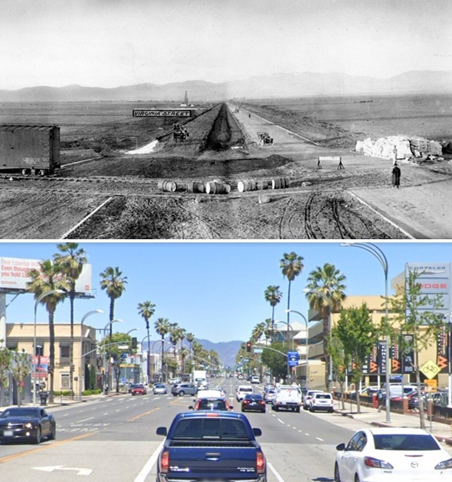 | (1940 vs 2022)* – Looking down toward the Los Encinos State Historic Park with the intersection of Ventura Boulevard and La Maida Street seen in lower right. Photo comparison by Jack Feldman. |