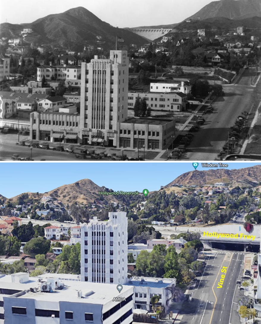 | (1928 vs 2022)* - Looking north from above Vine Street at Yucca toward the Hollywood Hills. In 1928 the white face of Mulholland Dam is clearly visible in Weid Canyon with Hollywood Reservoir behind it. In 2022 the dam is no longer visible from this vantage, and the Hollywood Freeway (US 101) now crosses the view at the north end of Vine Street. Photo comparison by Jack Feldman. |