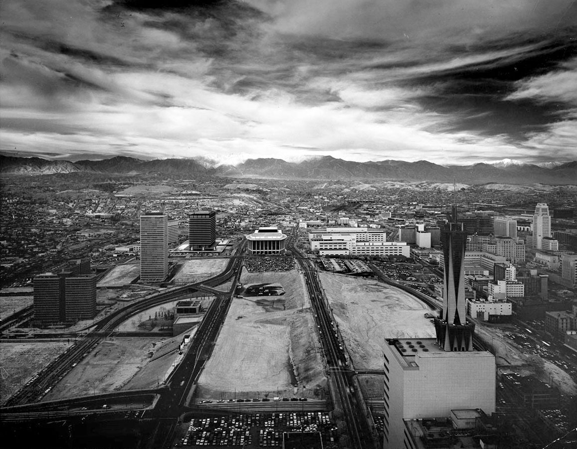 | (1963)* - Aerial view looking east showing Bunker Hill with the Dorothy Chandler Pavilion and DWP Building under construction. To the southeast are empty lots, one of which would later become the site of the Walt Disney Concert Hall. |