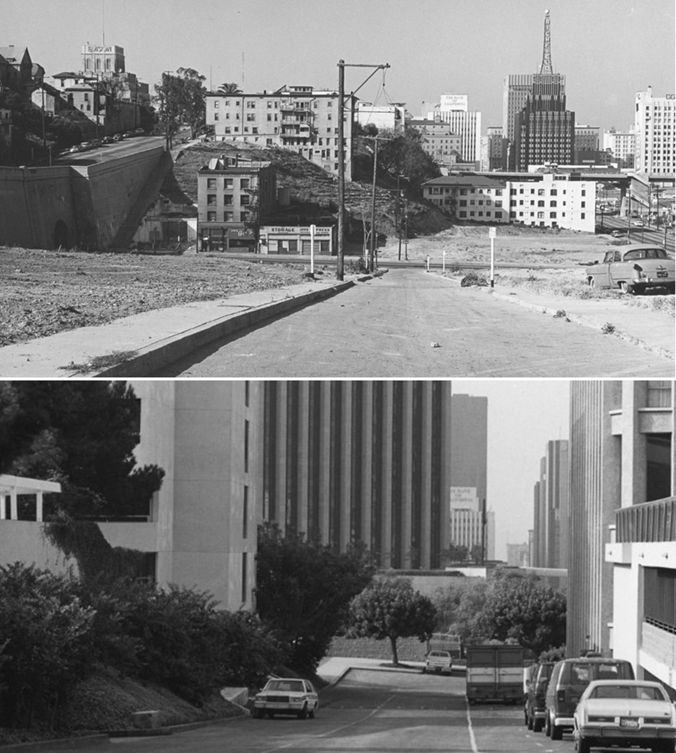 Historical Notes It should be noted that the top of the Dorothy Chandler Pavilion is about where the bottom of the buildings on the older shot is. They did not just remove the buildings, they also carved off the top of the hill. |