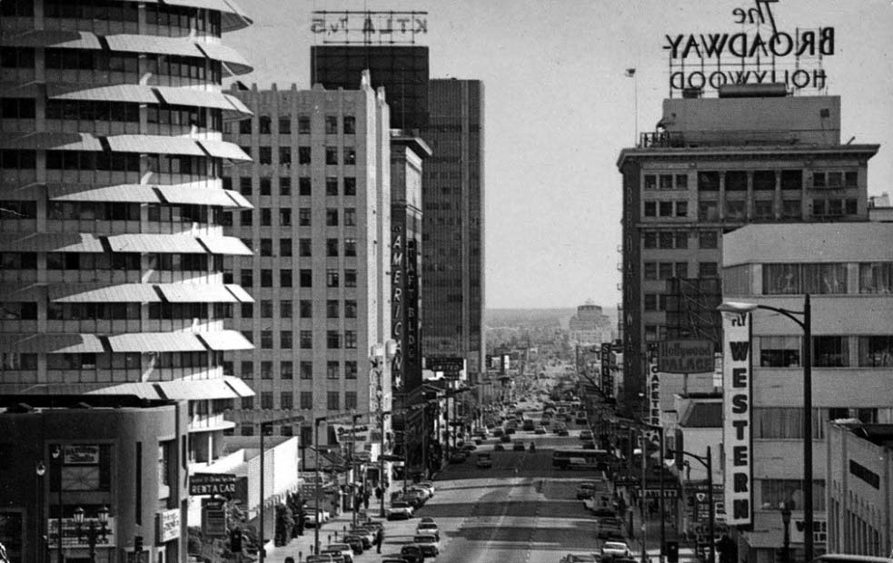 | (ca. 1956)^ - View looking north from the intersection of Hollywood and Vine. Photo courtesy of Authenticated News Archives / LA Curbed |