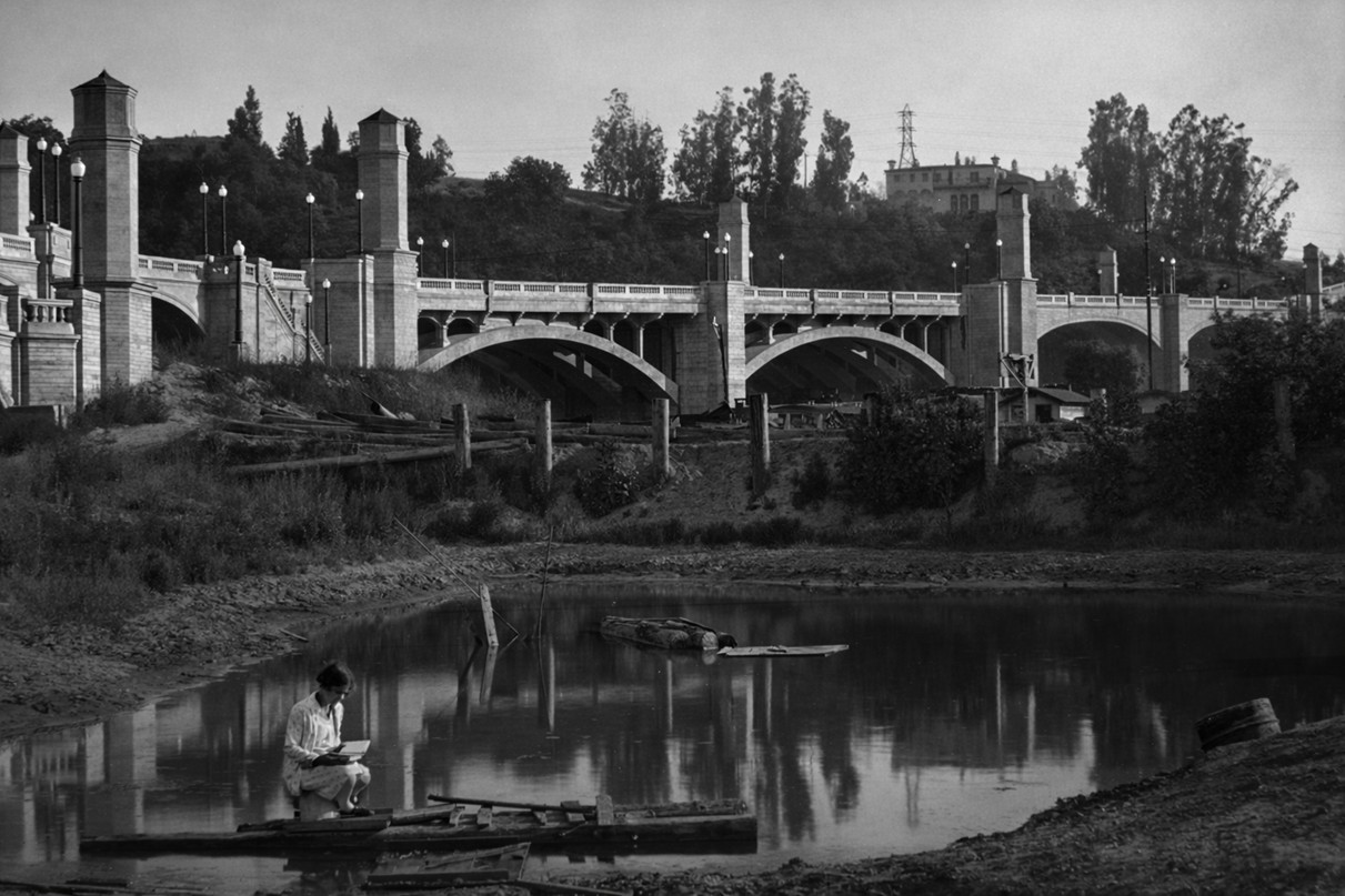 | (1930s)* – A woman reading on a makeshift wooden raft floating on a small body of water along the Los Angeles River, with the Glendale-Hyperion Bridge rising in the background. |