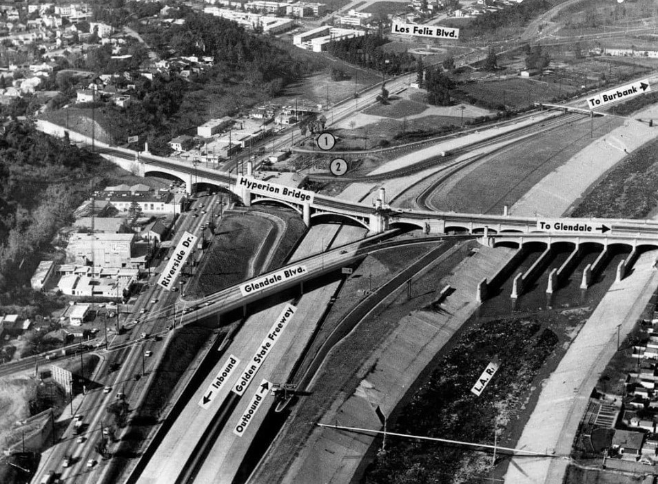 | (1956)* – View showing the eastern end of the Glendale-Hyperion Bridge descending over Riverside Drive near Glendale Boulevard in the Atwater District. |
