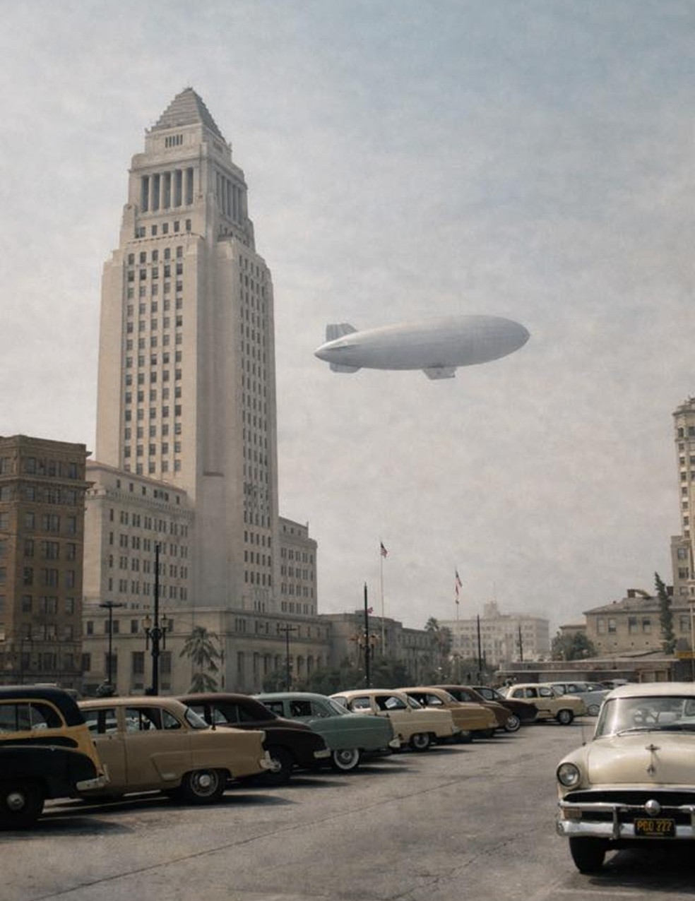 | (1954)* - Navy blimp passing City Hall through downtown smog. AI enhanced and colorized. |