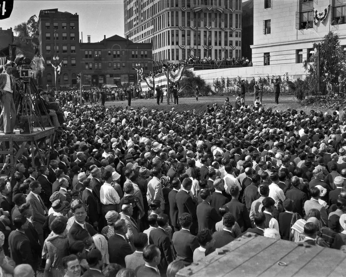 | (1928)* - Crowd at Los Angeles City Hall dedication ceremonies. The program was held on the South Terrace of City Hall. Buildings along Spring Street are visible in the background. News cameras appear at left. (Los Angeles Times Archive / UCLA) |