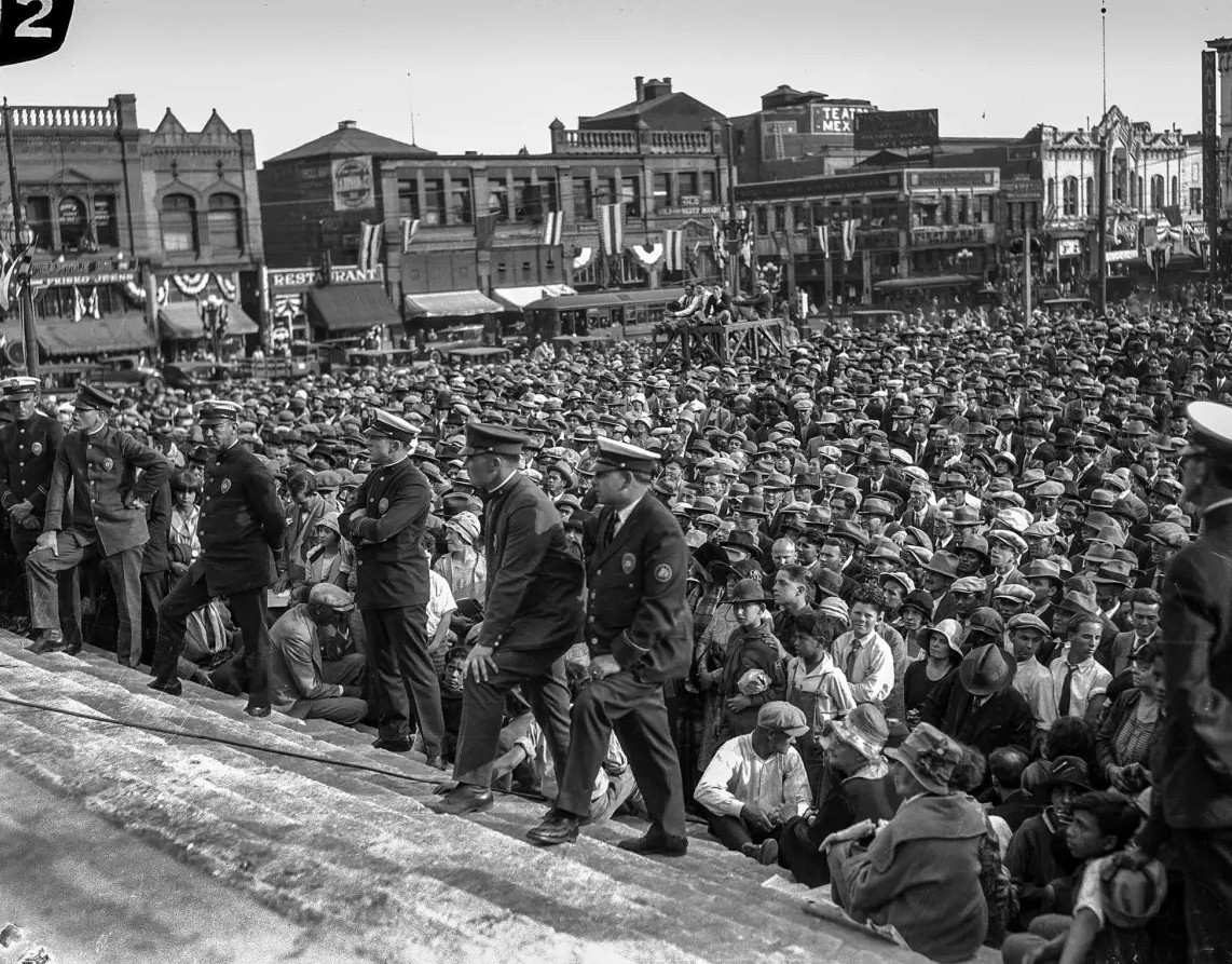| (1928)* - Crowd at Los Angeles City Hall dedication ceremonies with Main Street visible in the background. (Los Angeles Times Archive / UCLA) |