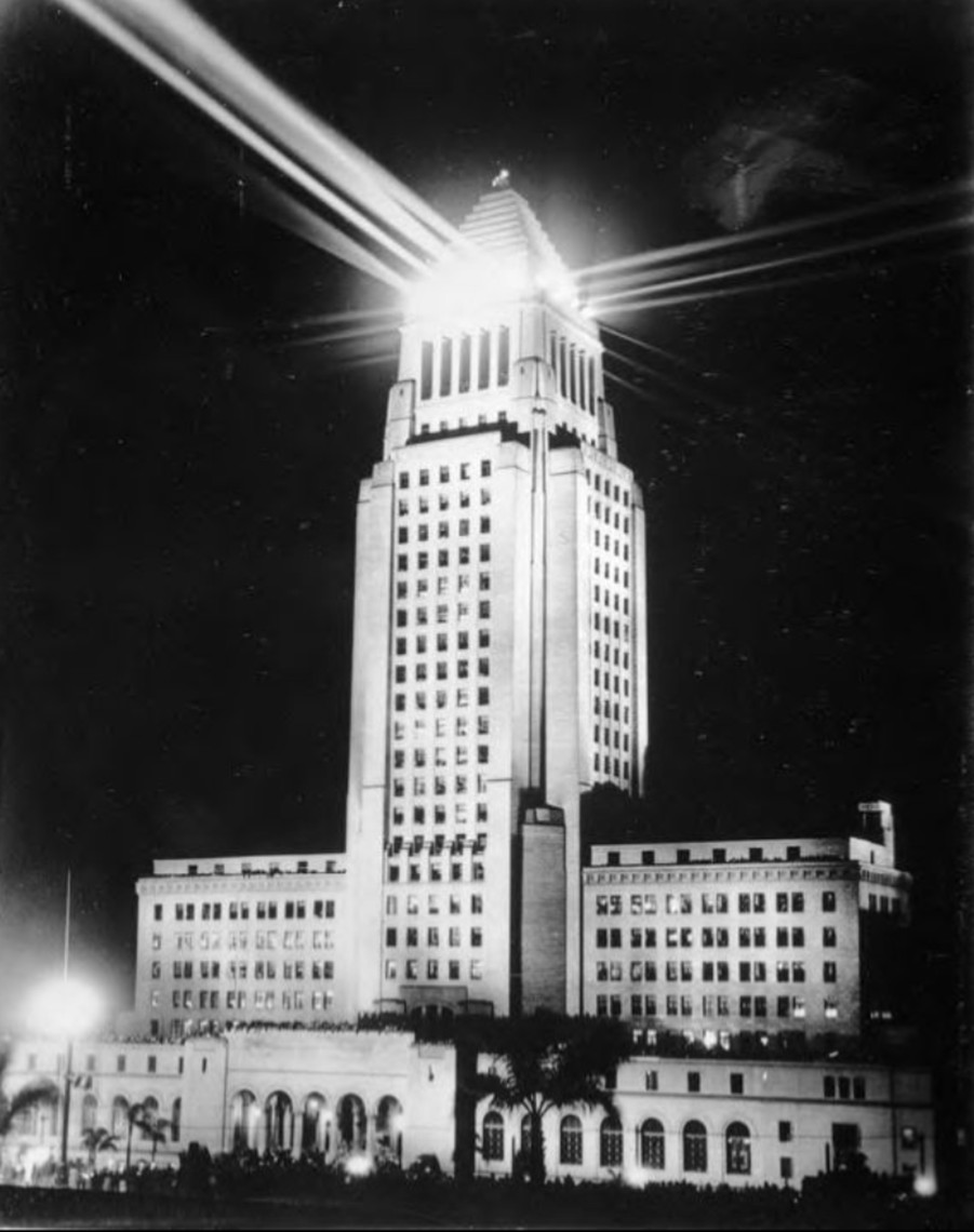 In 1936, City Hall again became the focus of a major public celebration, this time marking the arrival of power from Hoover Dam to Los Angeles. The building was dramatically illuminated as part of the Celebration of Electric Power, highlighting both technological achievement and the city’s growing infrastructure. The Lindbergh Beacon, mounted atop the tower, played a central visual role in the event. |