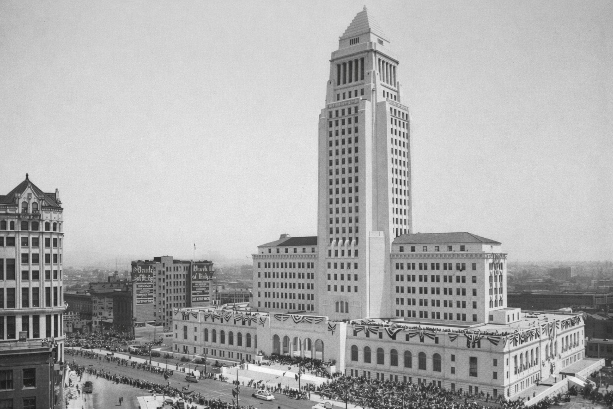 | (1928)* - Daytime dedication ceremony of the newly completed Los Angeles City Hall, photographed from the side facing 1st Street. |