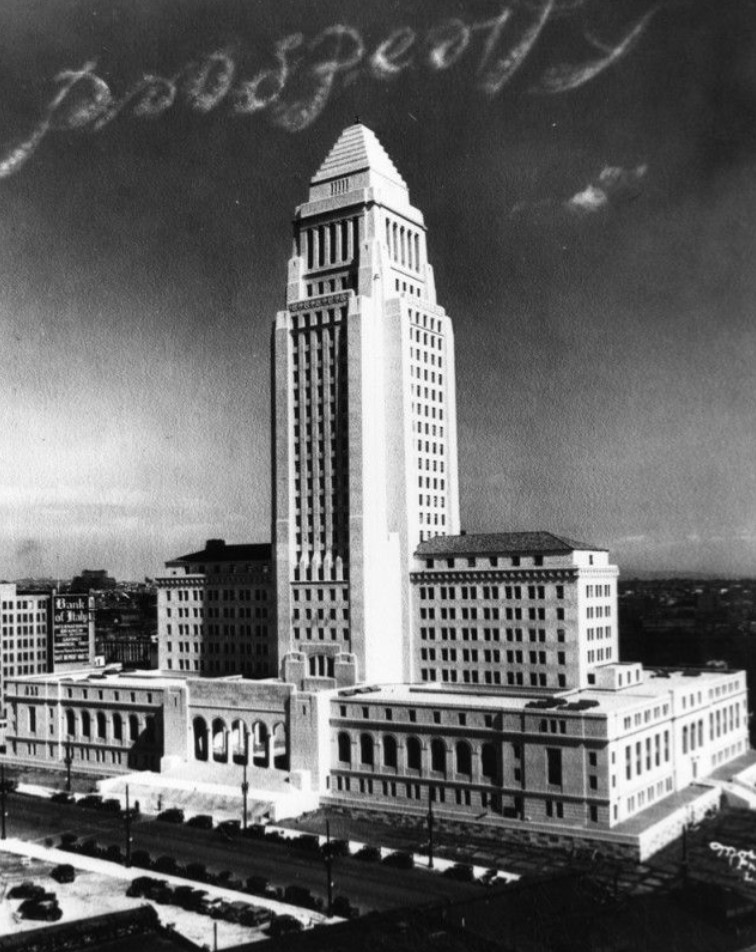 | (1928)* - View of the new Los Angeles City Hall as final preparations are made for its opening. Sky writing above the building reads “prosperity.” |
