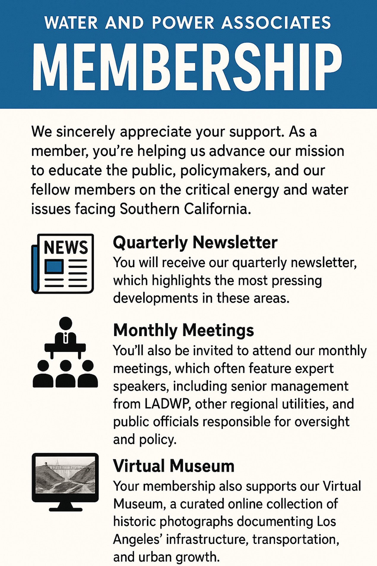 Click the Donate button to make a donation via PayPal to the Water and Power Associates, Inc. and support our ongoing endeavors researching, documenting and sharing information about the critical water and energy issues, and its history in the development of Southern California.