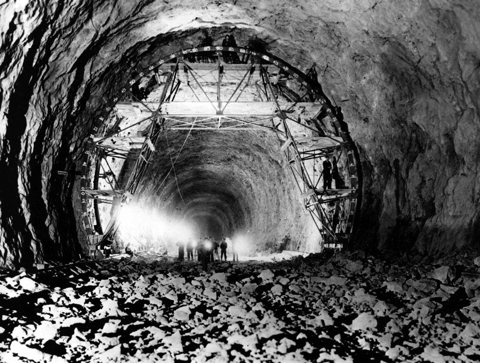 | (1934)* - Five workmen peer at the inside one of the four diversion tunnels. Behind them on the right is another tunnel. |