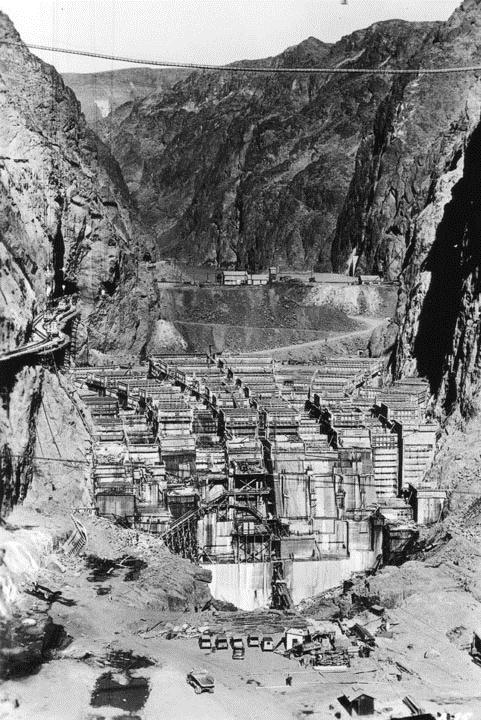 | (1934)^ - Hoover Dam takes shape from the concrete columns in which it was poured. |