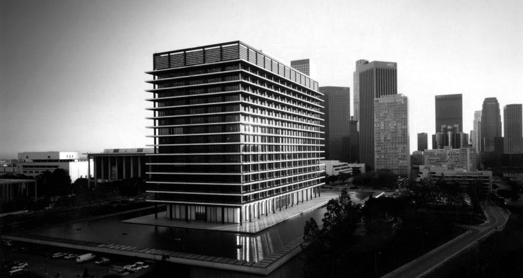 | (1966)* - View of the Department of Water and Power’s General Office Building from the front of the Dorothy Chandler Pavilion. Photo by Julius Shulman. |