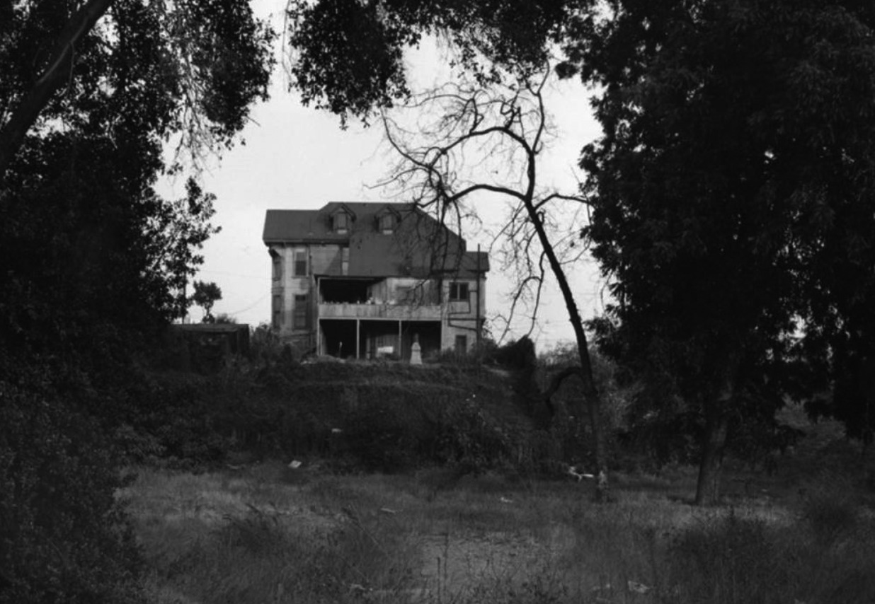 | (1959)* - Rear view of a residence located at 231 North Hope Street, known as the Basserman home. This is the current location of the Water and Power Building. The view is from Flower Street looking east through a vacant lot where a residence at 232 North Flower once stood. An incinerator is visible near the structure. Photo by William Reagh |