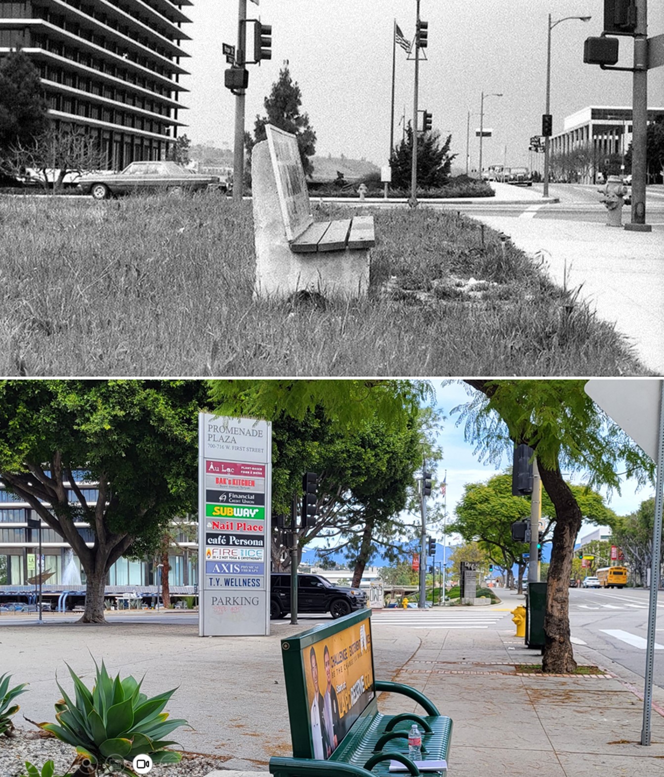 | (1971 vs 2025)* - Paired view south toward the Bunker Hill skyline from the DWP front entry bridge (photo comparison by Jack Feldman). |