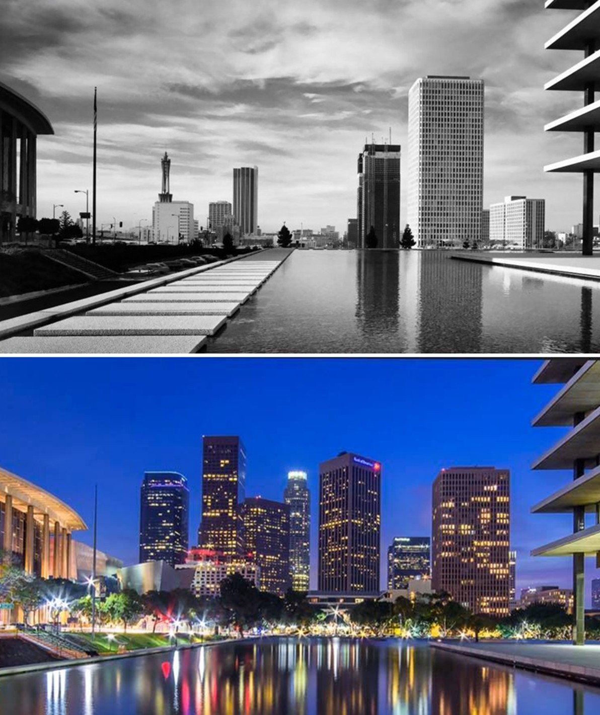 (1971 vs 2025)* - Paired view south toward the Bunker Hill skyline from the DWP front entry bridge (photo comparison by Jack Feldman). |
