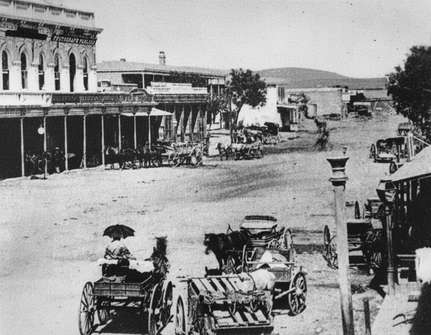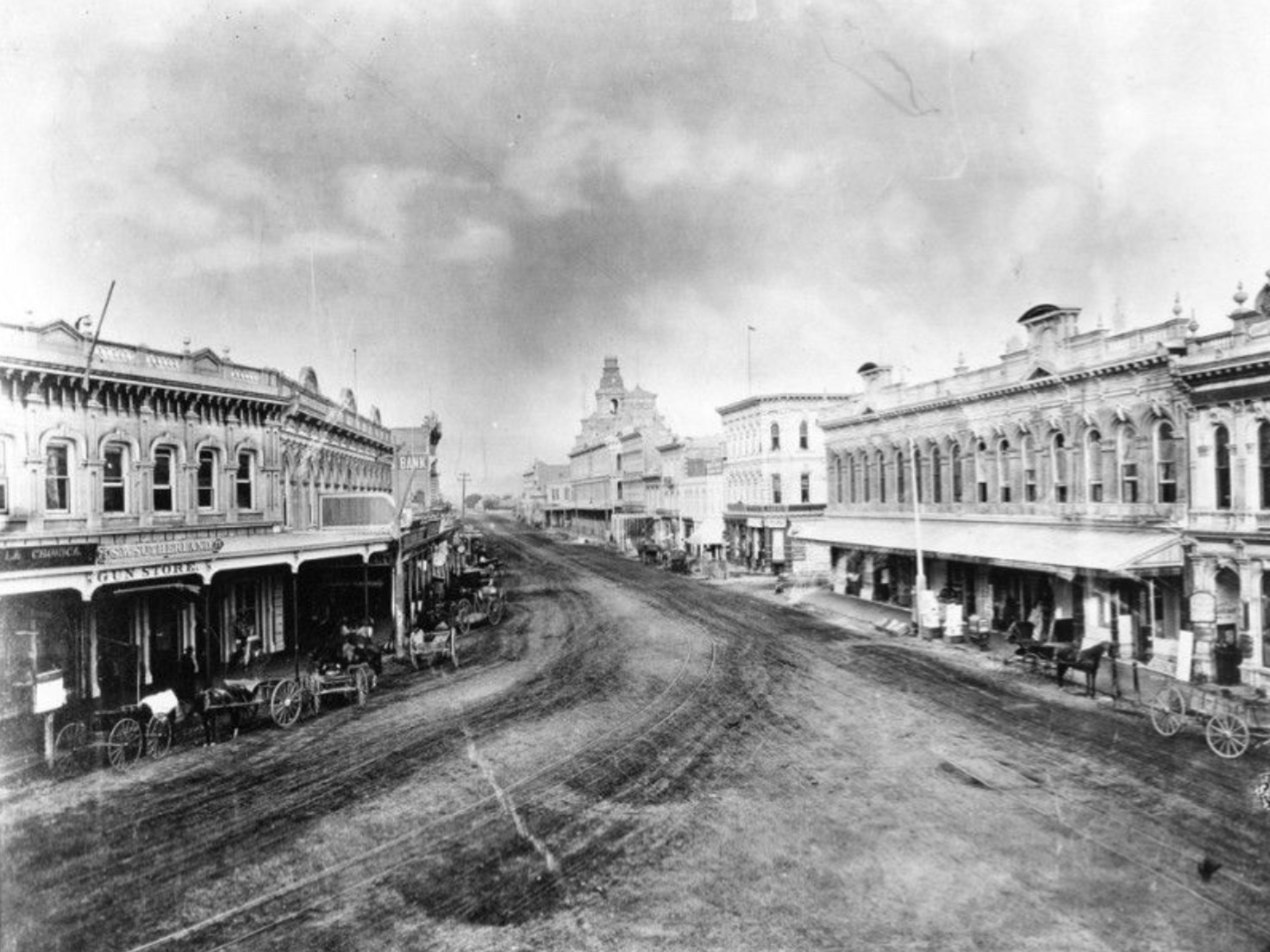 | (ca. 1870)^ - Looking east on First Street toward Broadway. (AI image enhancement and colorization by Richard Holoff). |