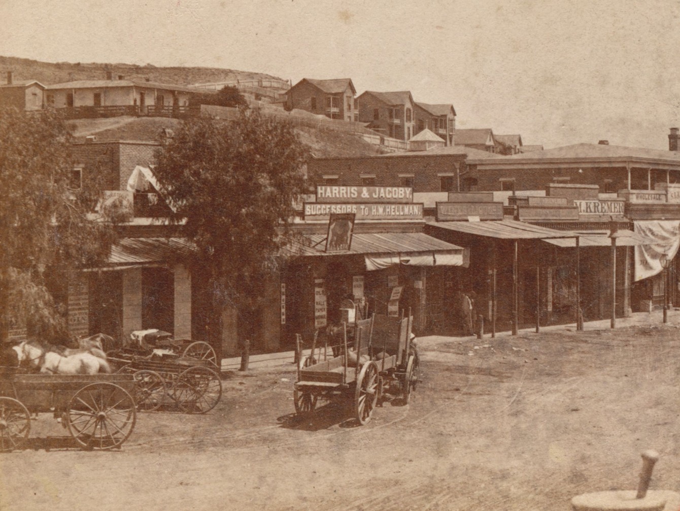 | (1870s)* - Early view of Eternity Street (later N. Broadway) in Sonora Town, northeast of Fort Moore Hill. |