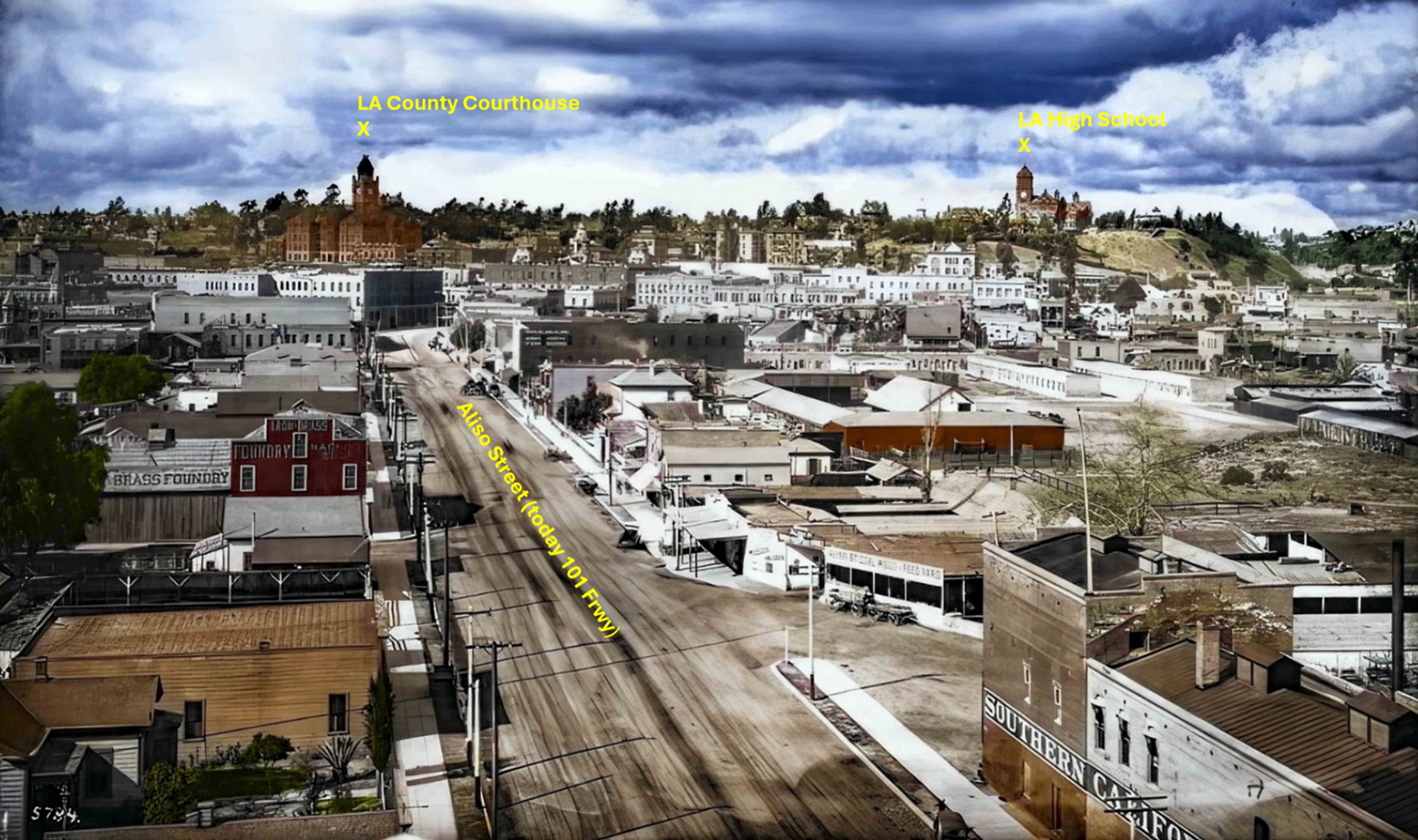 Historical Notes The J.W. Robinson mansion can be seen on the hilltop. It was located on Teed Street near Bella Vue Avenue (now Bellevue, this section of which would later become part of Sunset Boulevard). Teed Street was named after Freeman G. Teed who, in the 1880s and 90s, was LA City Clerk and President of the City Council. He was also a real estate speculator.^*# |