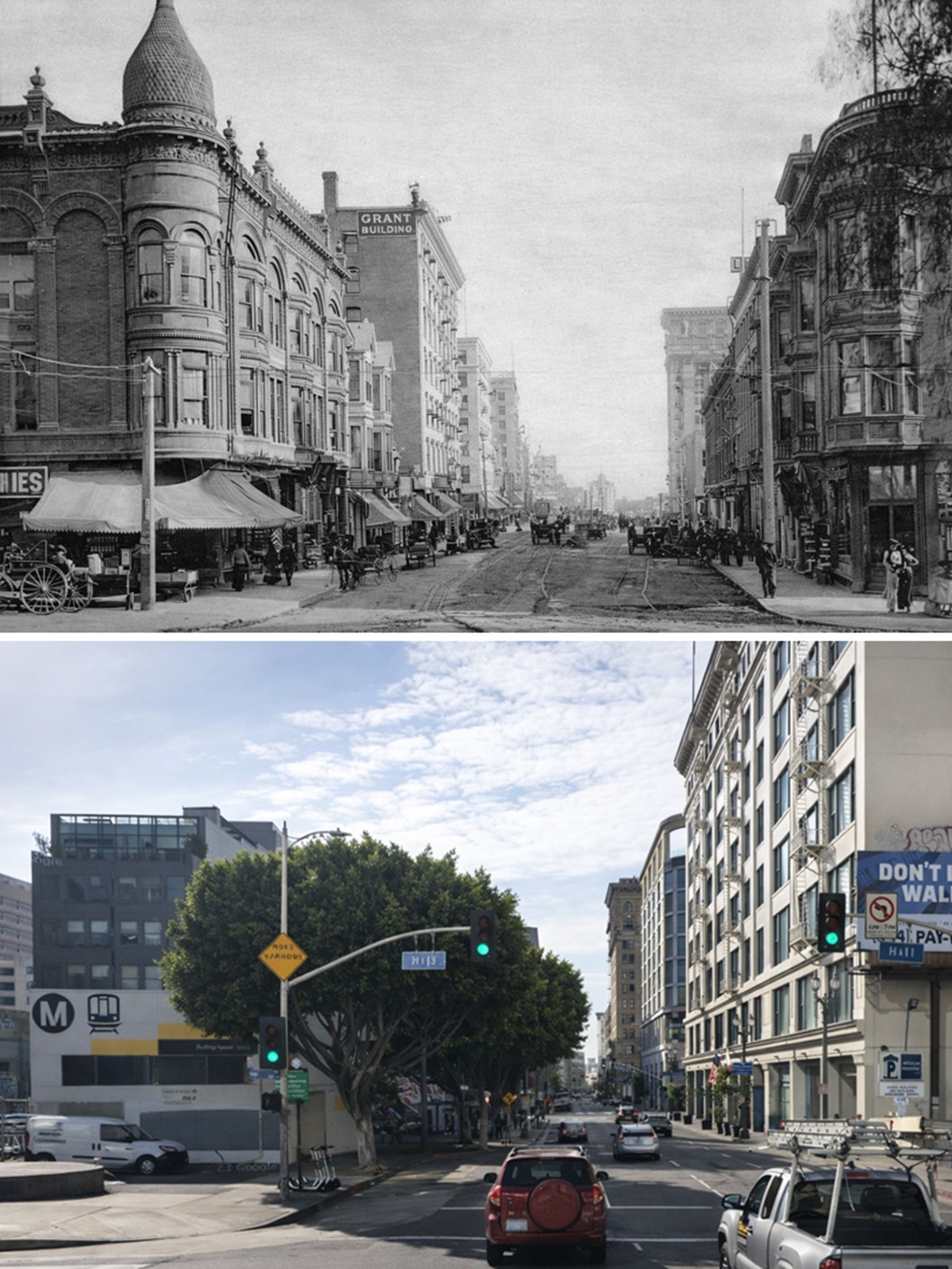 | (1890 vs 2022)* - Looking east on 4th Street at Hill Street. Photo comparison by Jack Feldman. |