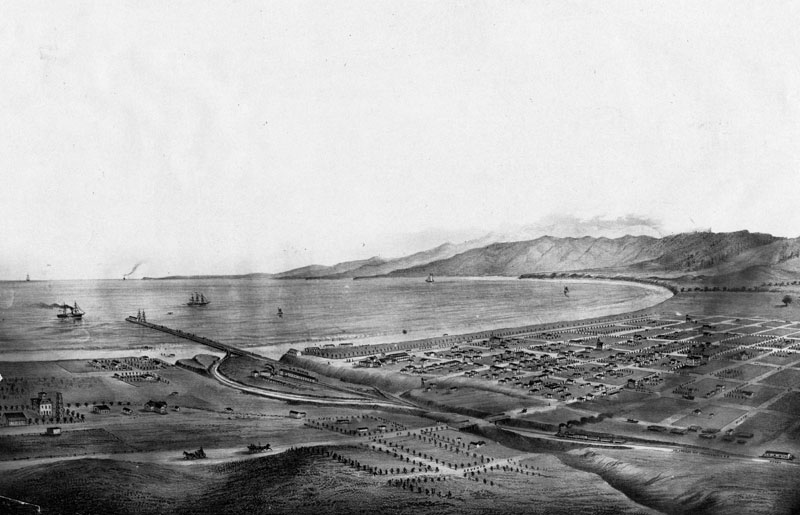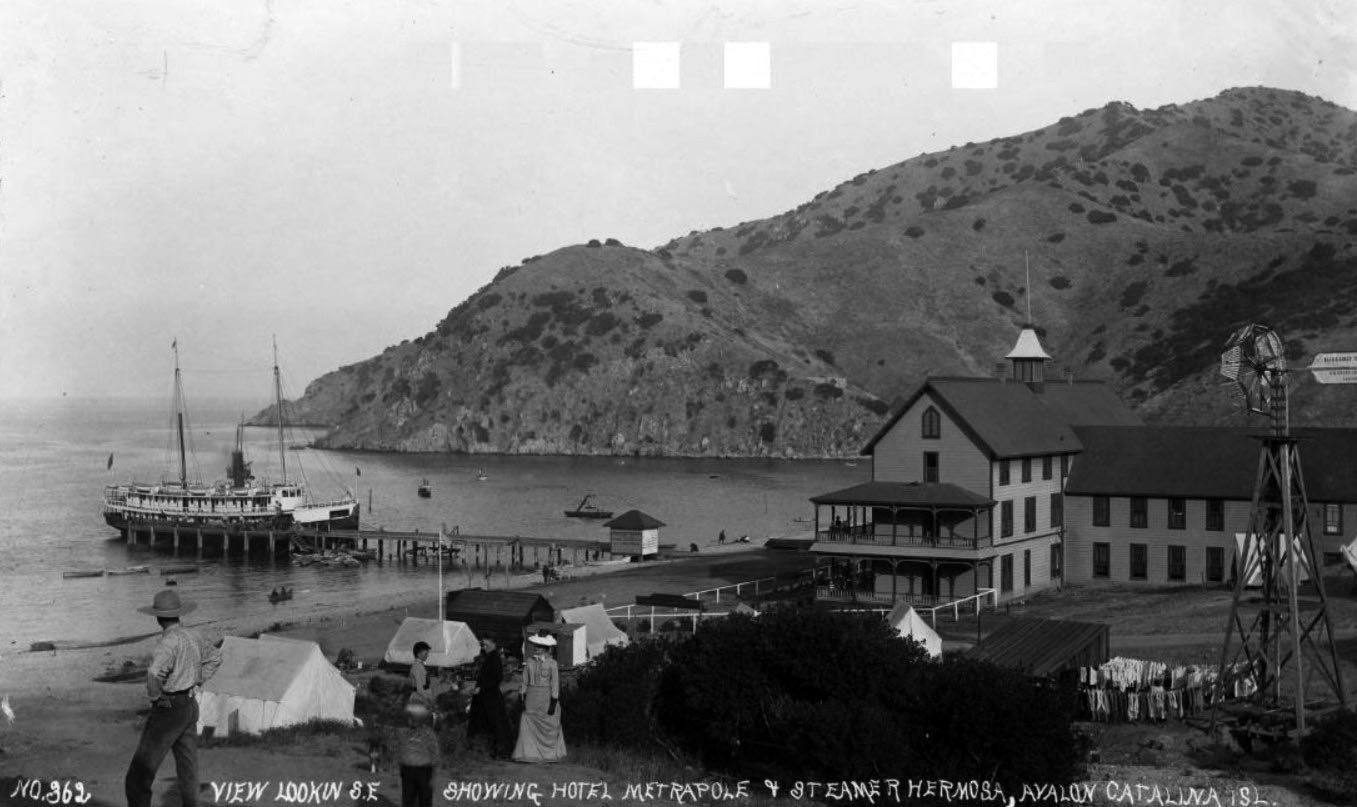 | (1891)#^*^ – Panoramic view of Avalon Bay on Santa Catalina Island. The rock formation called Sugarloaf Point is at upper-right. The steamship S.S. Hermosa makes its way out toward the ocean away from a pier which is located near where the Hotel Metropole stands. House-tents can be seen all along the beach. At right stands a large Victorian-style home (Holly Hill House) with unobstructed views of the bay. The house still exists today and is Avalon's oldest remaining structure. |