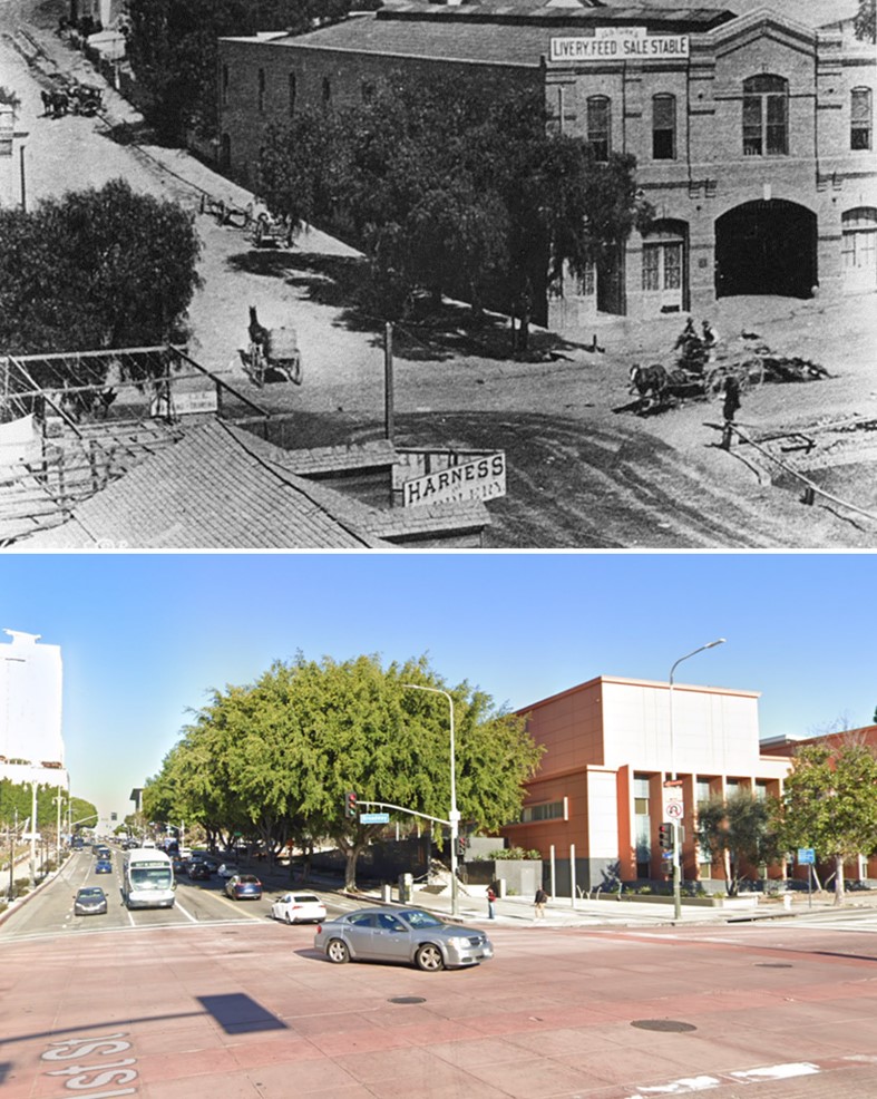 | (1870s vs 2020s) - Looking northeast on Broadway from just south of Cesar Chavez Ave (Sunset Blvd). Photo comparison by Jack Feldman. |