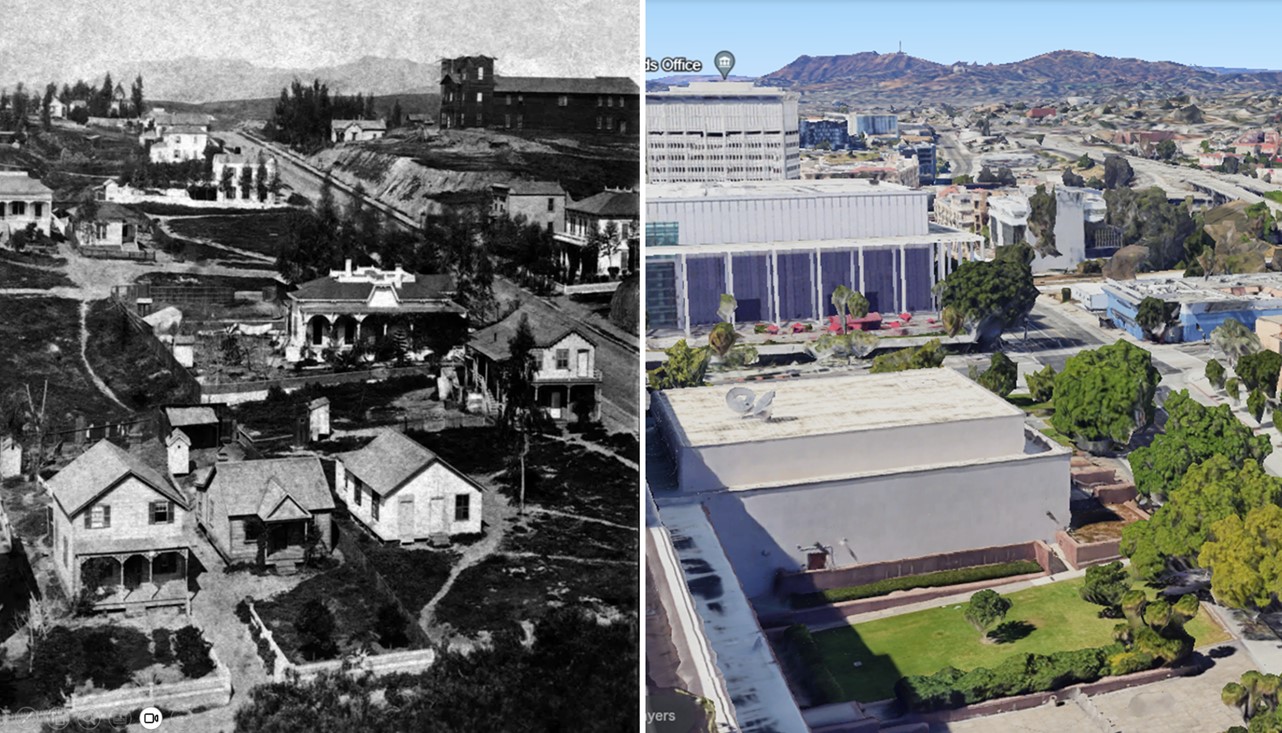 | (1875 vs 2022)* – View looking NW showing Temple Street running diagonally on the right with the Hollywood Hills in the Background. In the early photo, Olive Street is seen at bottom and Horticultural Hall is seen at top of the hill (aka Horticultural Hill). Note how much the hill as been chopped down over the years. Photo comparison by Jack Feldman. |