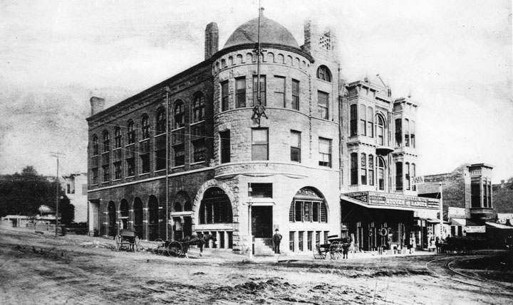 | (1886)* - The northwest corner of 1st and Broadway in 1886. Horses, carriages, and liveries dominated the scene, with the De Turk Livery Feed & Sale Stable occupying this corner. |